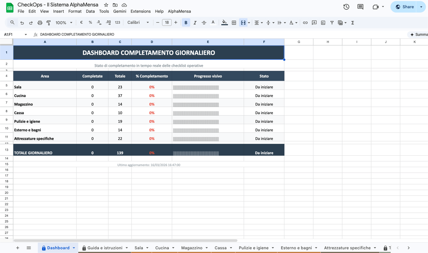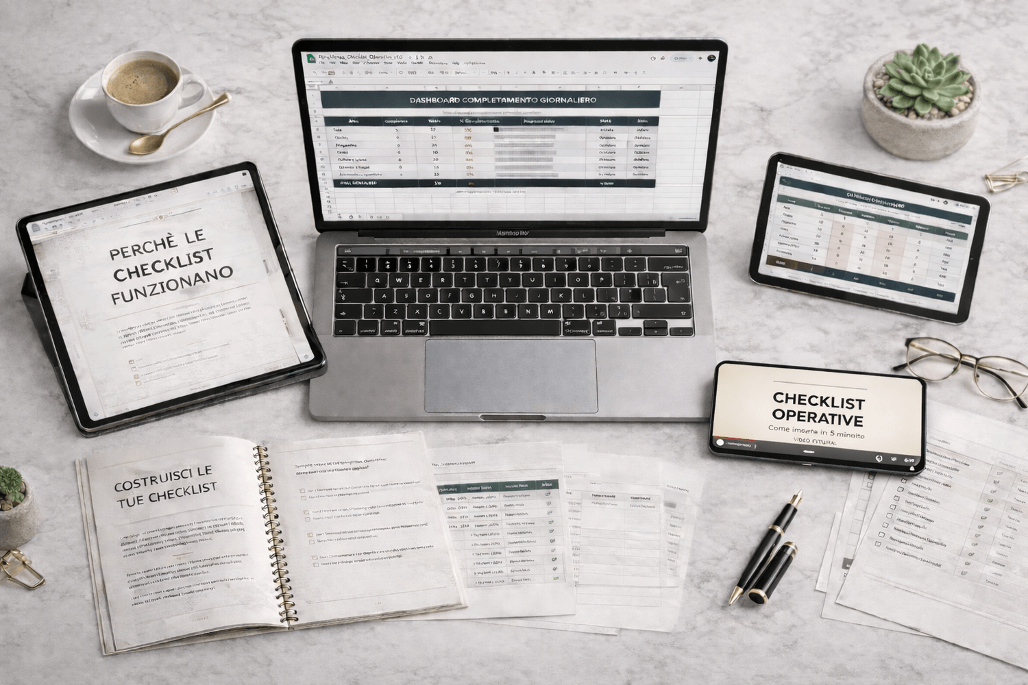 Un Google Sheet con 150 checklist operative strutturate e pronte all'uso, con automazioni integrate: dashboard per controllo da remoto, tracciamento settimanale, formattazione automatica e tanti moduli utili.